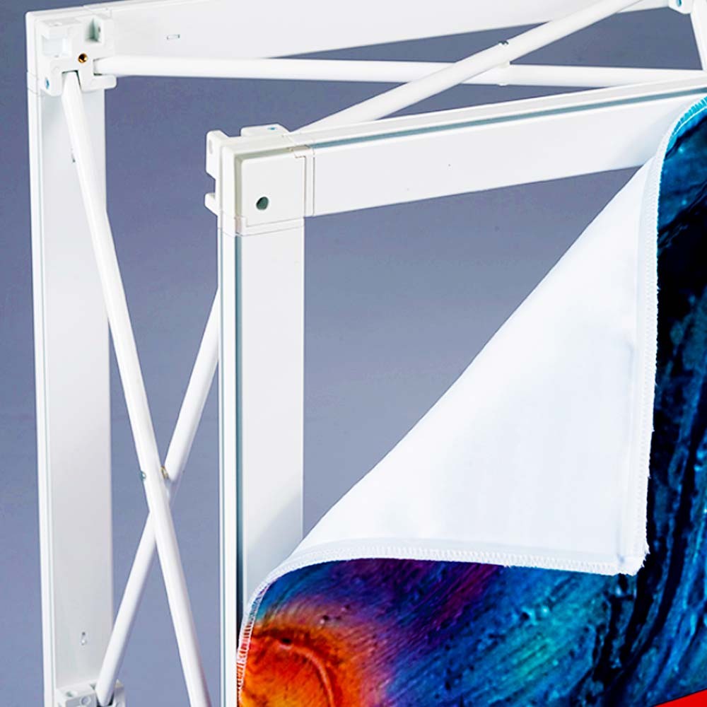 SEG technology is an innovative graphic installation method that surpasses others in aesthetics. SEG involves silicon edging around the print that seamlessly slots into the pop up wall frame. The SEG display wall and hook and loop fastener display share a similar frame - simply take out the folded frame, gently pull it open, fasten the corresponding connection buttons, and the entire frame is ready. After the frame clicks into place, it is easy to insert your silicon edge fabric graphic. Additionally, we provide a carry bag with wheels, ensuring not only a quick setup but also convenient transportation.